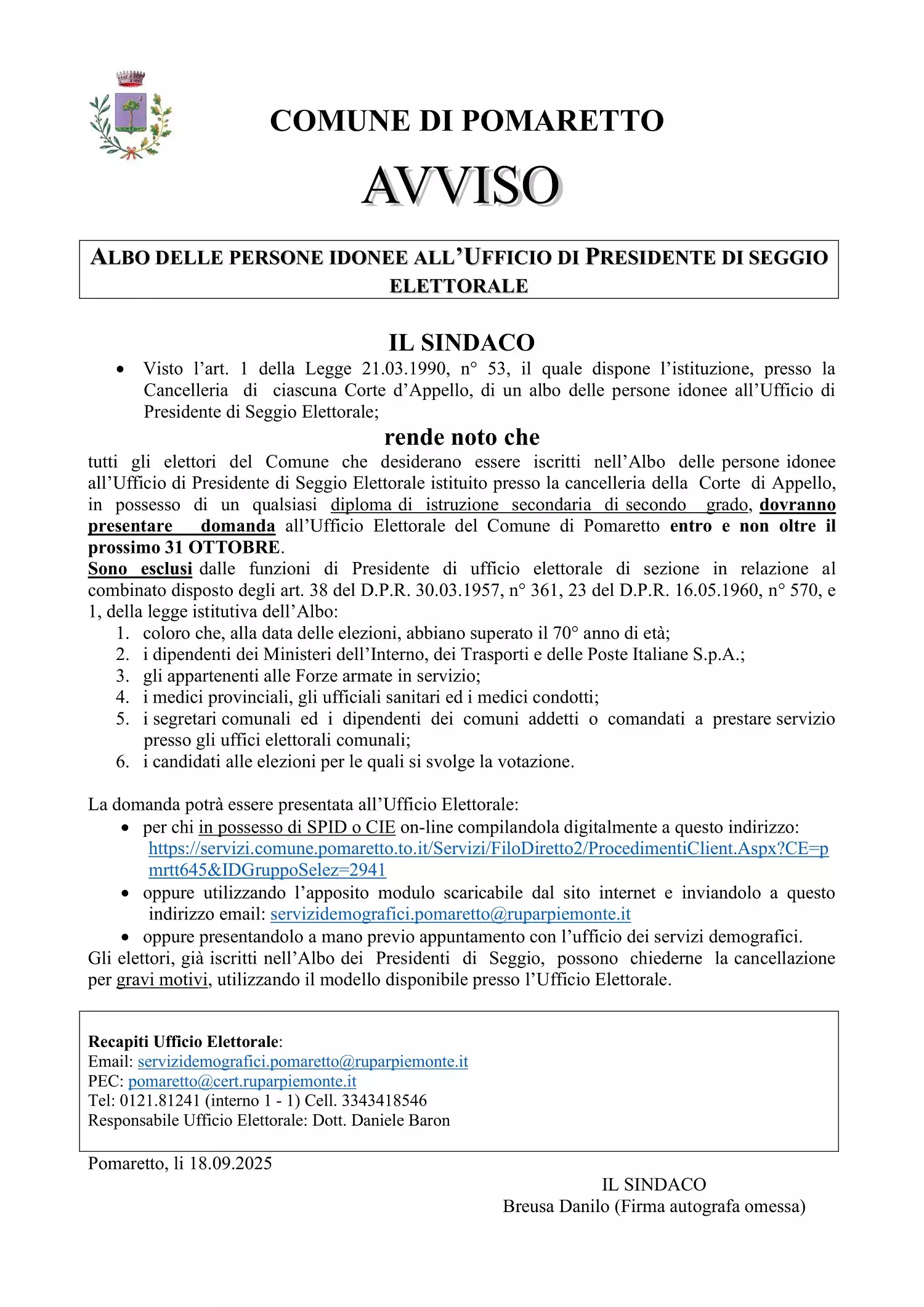 Tutti gli elettori del Comune che desiderano essere iscritti nell’Albo delle persone idonee all’Ufficio di Presidente di Seggio Elettorale istituito presso la cancelleria della Corte di Appello, in possesso di un qualsiasi diploma di istruzione secondaria di secondo grado, dovranno presentare domanda all’Ufficio Elettorale del Comune di Pomaretto entro e non oltre il prossimo 31 OTTOBRE.