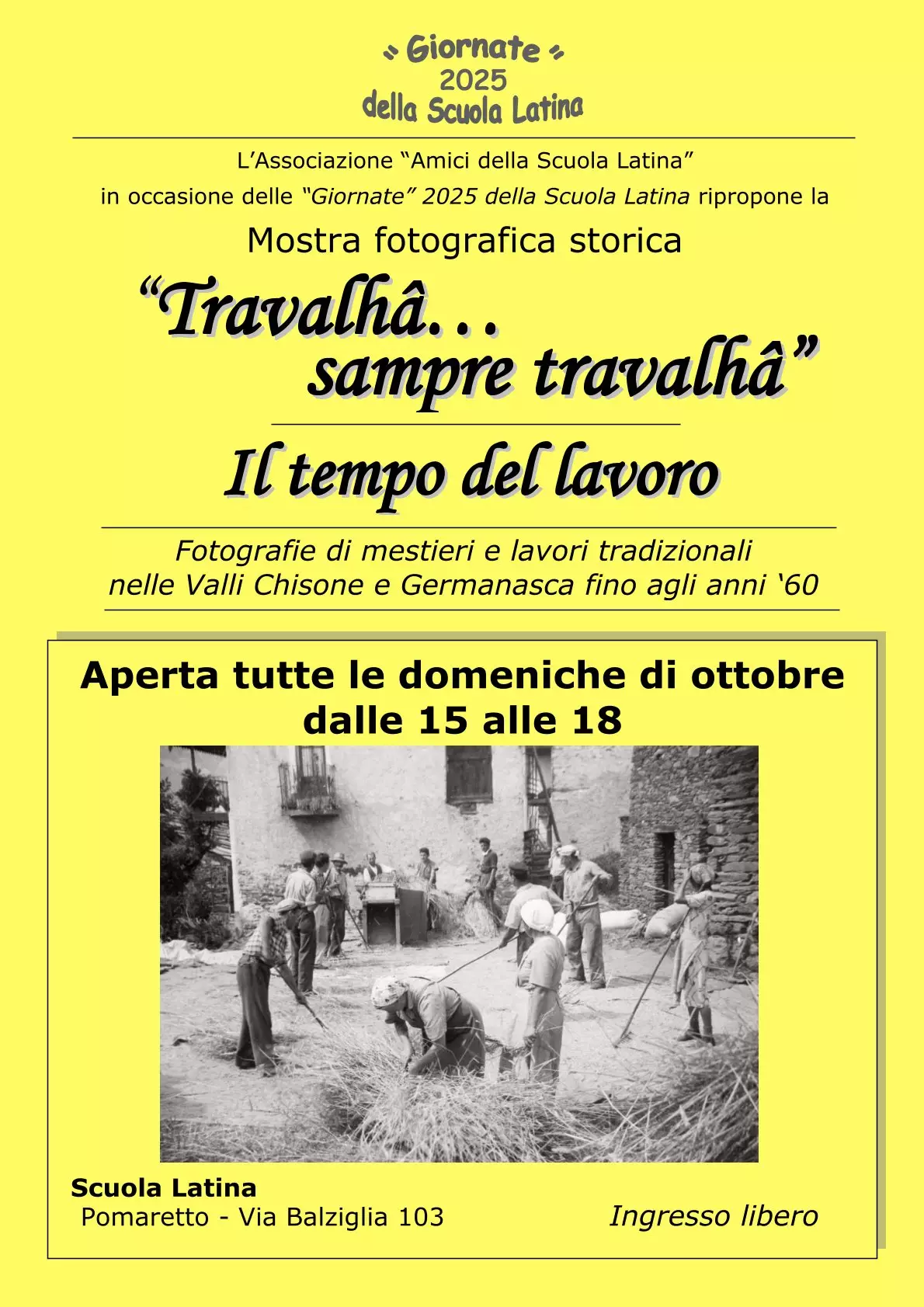 Sempre domenica 5 ottobre, nello stesso orario di apertura de “Gli antichi mestieri”, sarà possibile anche visitare la mostra fotografica storica “Travalhâ… sampre travalhâ – Il tempo del lavoro”. La mostra presenta una serie di fotografie in bianco/nero sui mestieri e lavori tradizionali nelle Valli Chisone e Germanasca, fino agli anni ‘60. Inaugurata domenica 28 settembre in occasione della Giornata della cultura materiale della Scuola Latina, la mostra rimarrà aperta tutte le domeniche di ottobre, dalle 15 alle 18, sempre con ingresso libero.