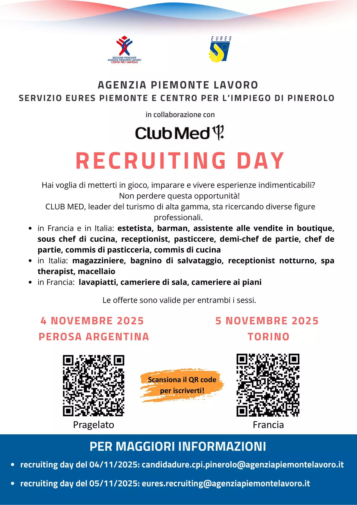 Descrizione Agenzia Piemonte lavoro servizio Eures Piemonte e Centro per l’impiego di Pinerolo in collaborazione con Club Med organizzano evento di selezioni del Club Med che si svolgerà il 4 novembre a Perosa ArgentinaPer iscriversi scansionare il QR code presente sulla locandina oppure - Per le offerte dedicate alla struttura di Pragelato, compila il form: https://docs.google.com/.../1FAIpQLSeS0PtLR5TOJv.../viewform - Per le offerte dedicate alle strutture francesi, compila il form: https://docs.google.com/.../1FAIpQLScH.../viewform maggiori info candidadure.cpi.pinerolo@agenziapiemontelavoro.it