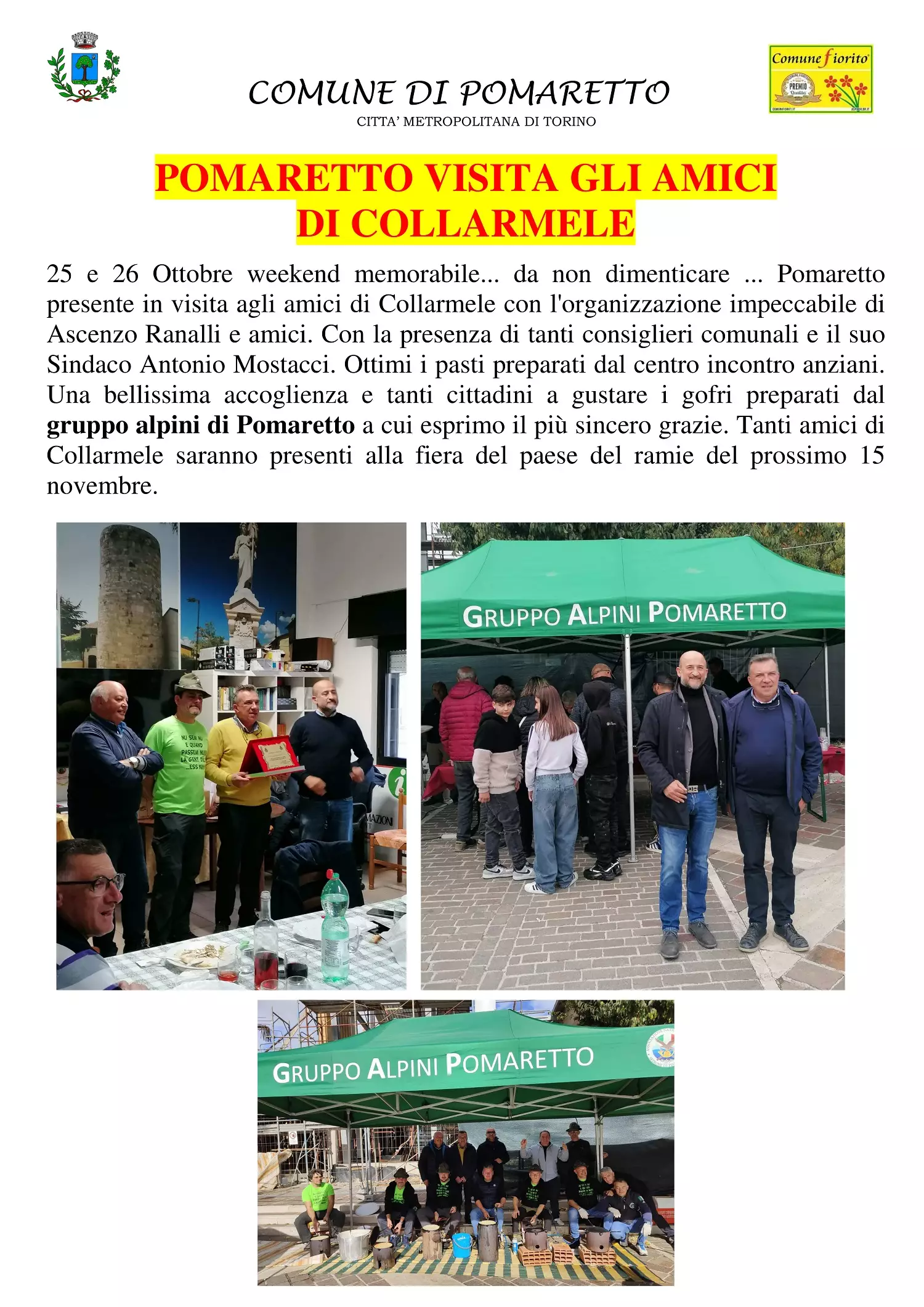 25 e 26 Ottobre weekend memorabile... da non dimenticare ... Pomaretto presente in visita agli amici di Collarmele con l'organizzazione impeccabile di Ascenzo Ranalli e amici. Con la presenza di tanti consiglieri comunali e il suo Sindaco Antonio Mostacci. Ottimi i pasti preparati dal centro incontro anziani. Una bellissima accoglienza e tanti cittadini a gustare i gofri preparati dal gruppo alpini di Pomaretto a cui esprimo il più sincero grazie. Tanti amici di Collarmele saranno presenti alla fiera del paese del ramie del prossimo 15 novembre.