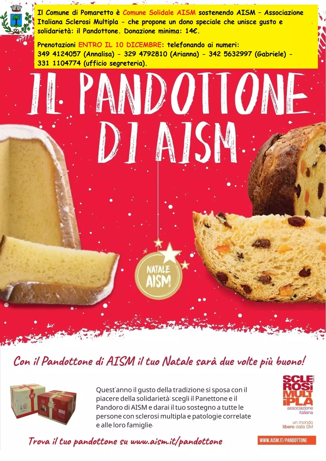 Il Comune di Pomaretto è Comune Solidale AISM sostenendo AISM – Associazione Italiana Sclerosi Multipla - che propone un dono speciale che unisce gusto e solidarietà: il Pandottone. Donazione minima: 14€.
