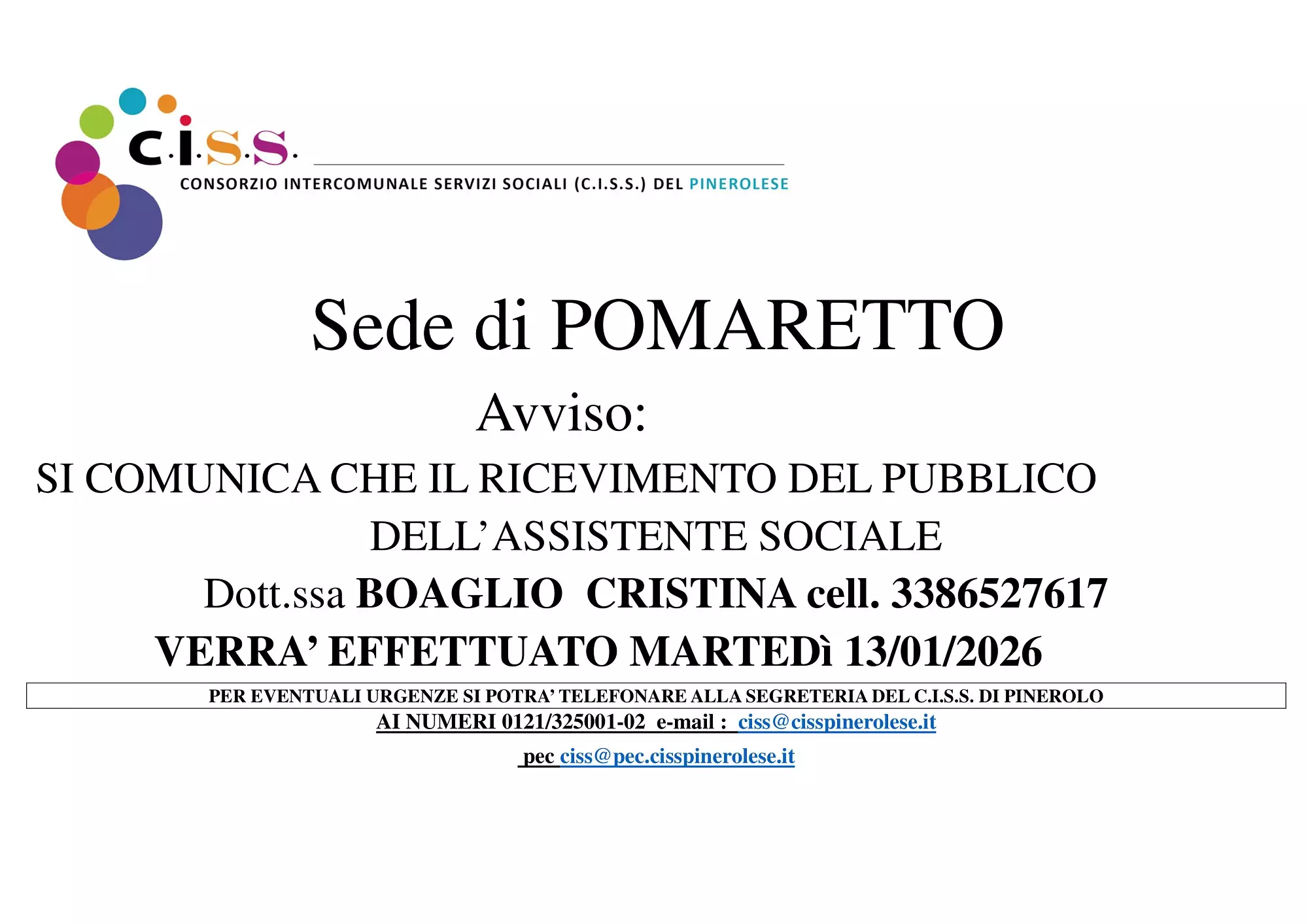 Descrizione VARIAZIONE ORARIO SI COMUNICA CHE IL RICEVIMENTO DEL PUBBLICO DELL’ASSISTENTE SOCIALE Dott.ssa BOAGLIO CRISTINA cell. 3386527617 VERRA’ EFFETTUATO MARTEDì 13/01/2026PER EVENTUALI URGENZE SI POTRA’ TELEFONARE ALLA SEGRETERIA DEL C.I.S.S. DI PINEROLOAI NUMERI 0121/325001-02 e-mail: ciss@cisspinerolese.it pec ciss@pec.cisspinerolese.it