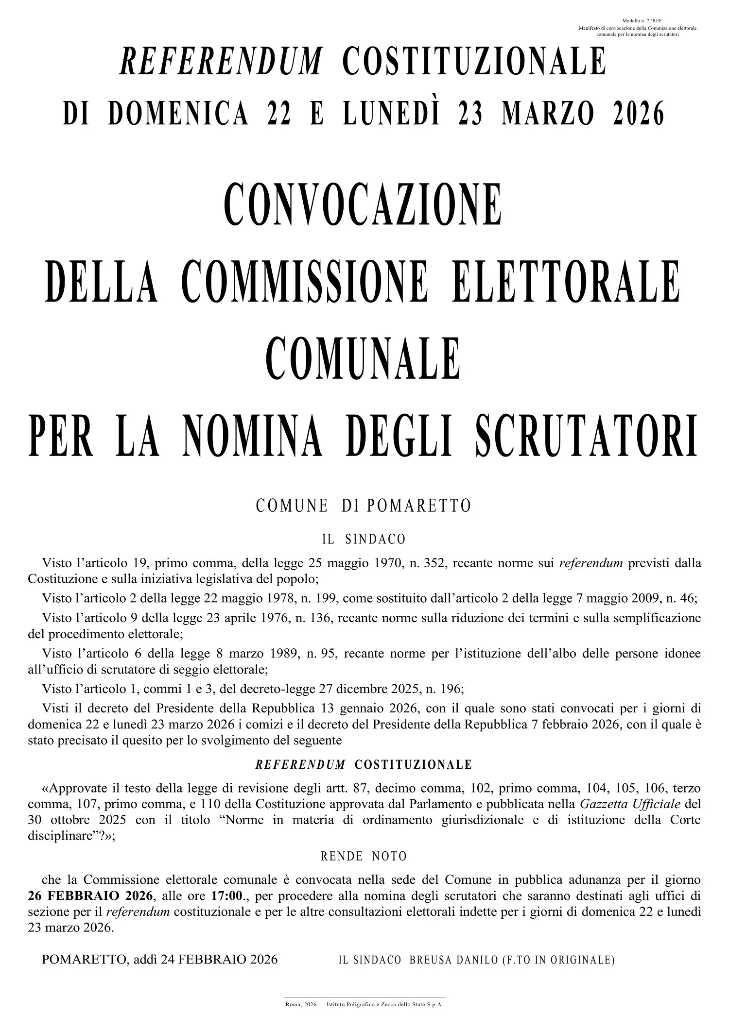La Commissione elettorale comunale è convocata nella sede del Comune in pubblica adunanza per il giorno 26 FEBBRAIO 2026, alle ore 17:00, per procedere alla nomina degli scrutatori che saranno destinati agli uffici di sezione per il referendum costituzionale e per le altre consultazioni elettorali indette per i giorni di domenica 22 e lunedì 23 marzo 2026.