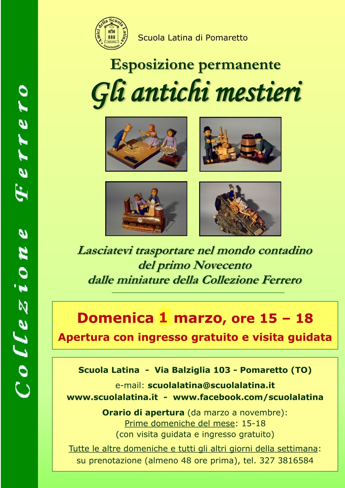 Domenica 1° marzo dalle 15 alle 18 Esposizione “Gli antichi mestieri”, basata sulla Collezione Ferrero. Le aperture fisse, con ingresso gratuito e visita guidata, avverranno tutte le prime domeniche del mese: dopo la domenica 1° marzo, il 5 aprile (Pasqua), il 3 maggio, e così via.