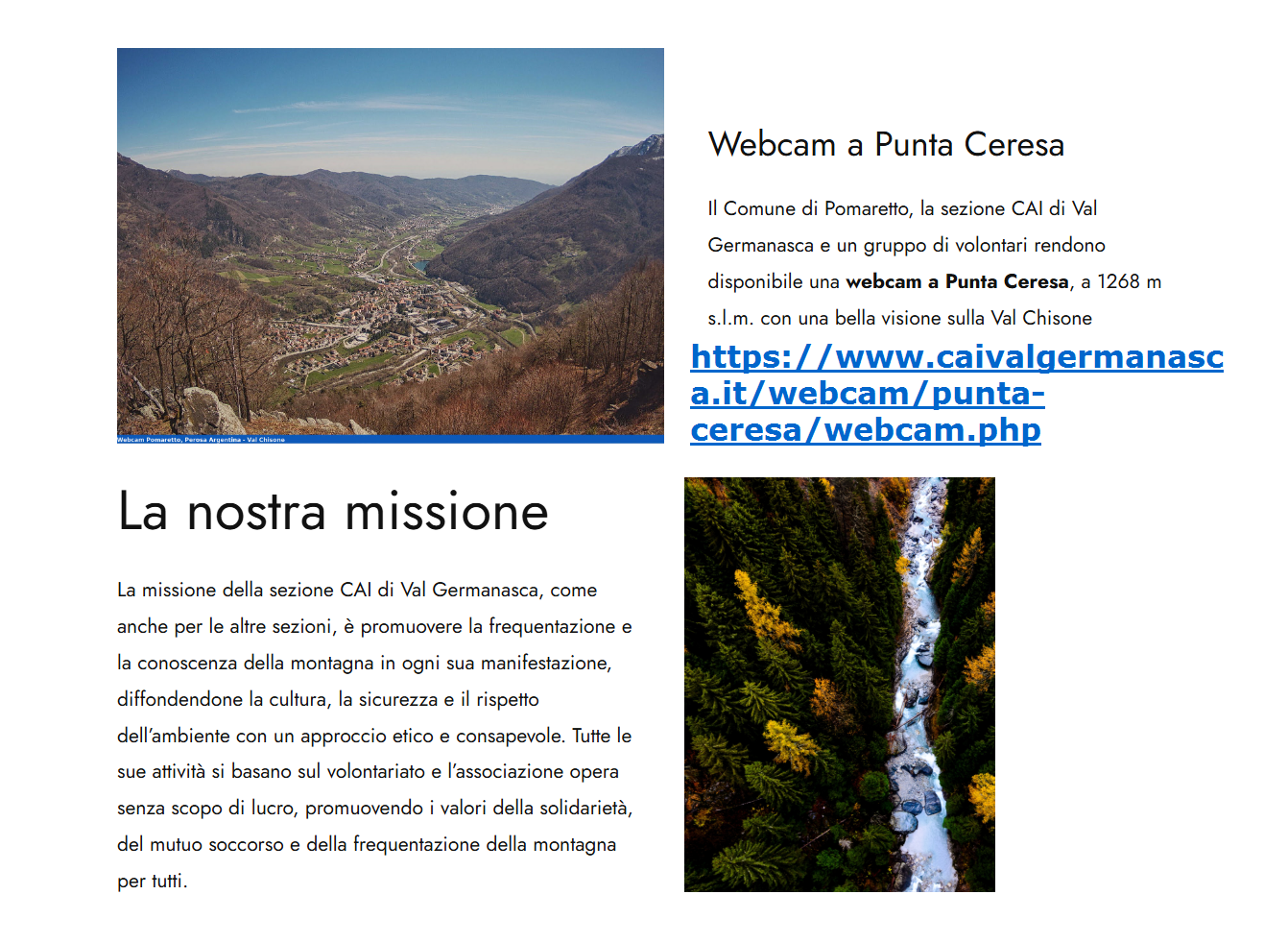 Descrizione Il Comune di Pomaretto, la sezione CAI di Val Germanasca e un gruppo di volontari rendono disponibile una webcam a Punta Ceresa, a 1268 m s.l.m. con una bella vista sulla bassa Val Chisone. https://www.caivalgermanasca.it/webcam/punta-ceresa/webcam.php