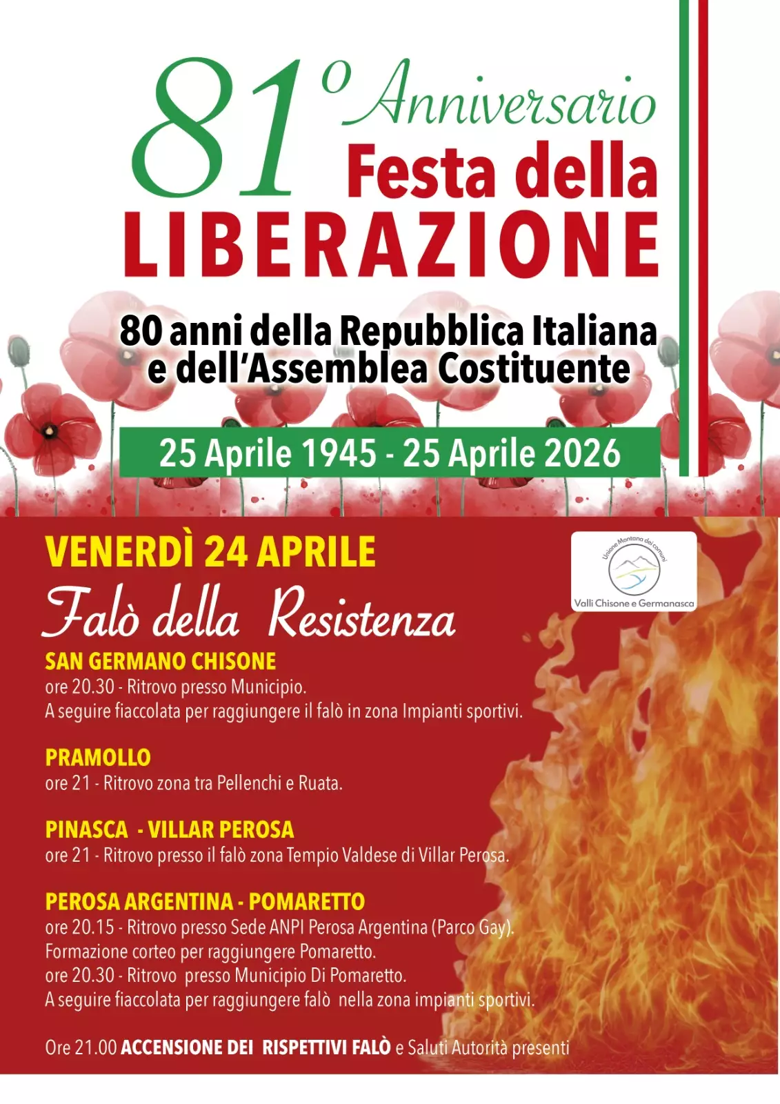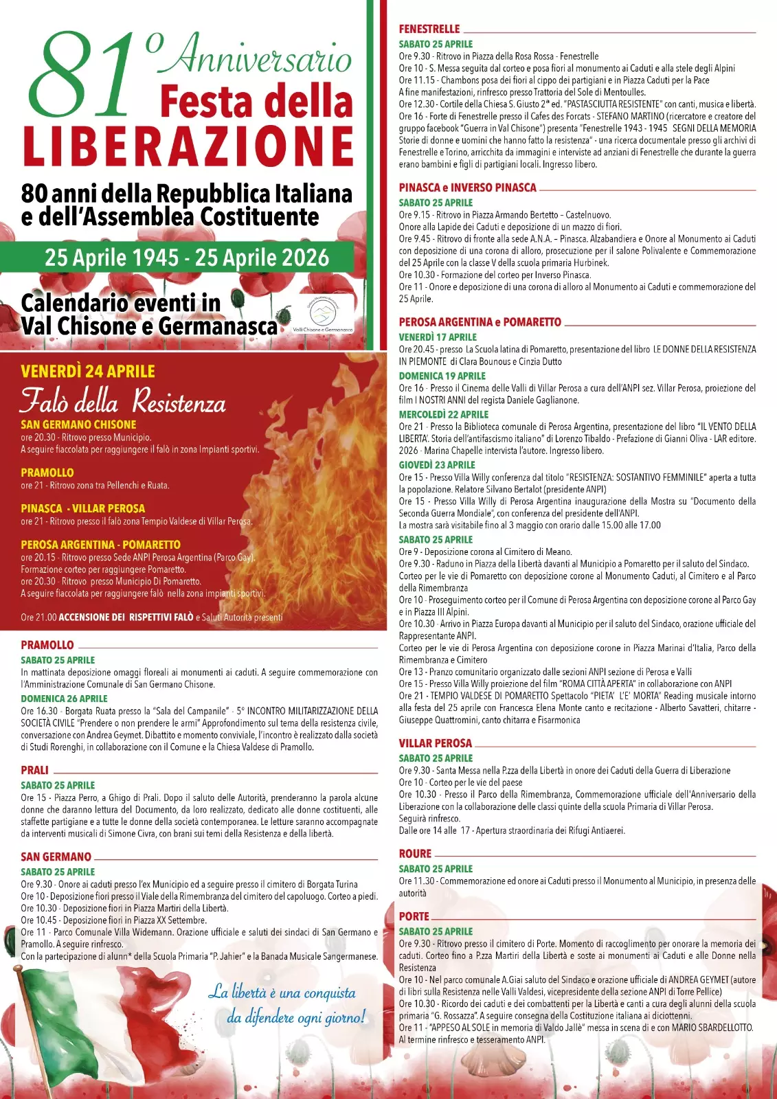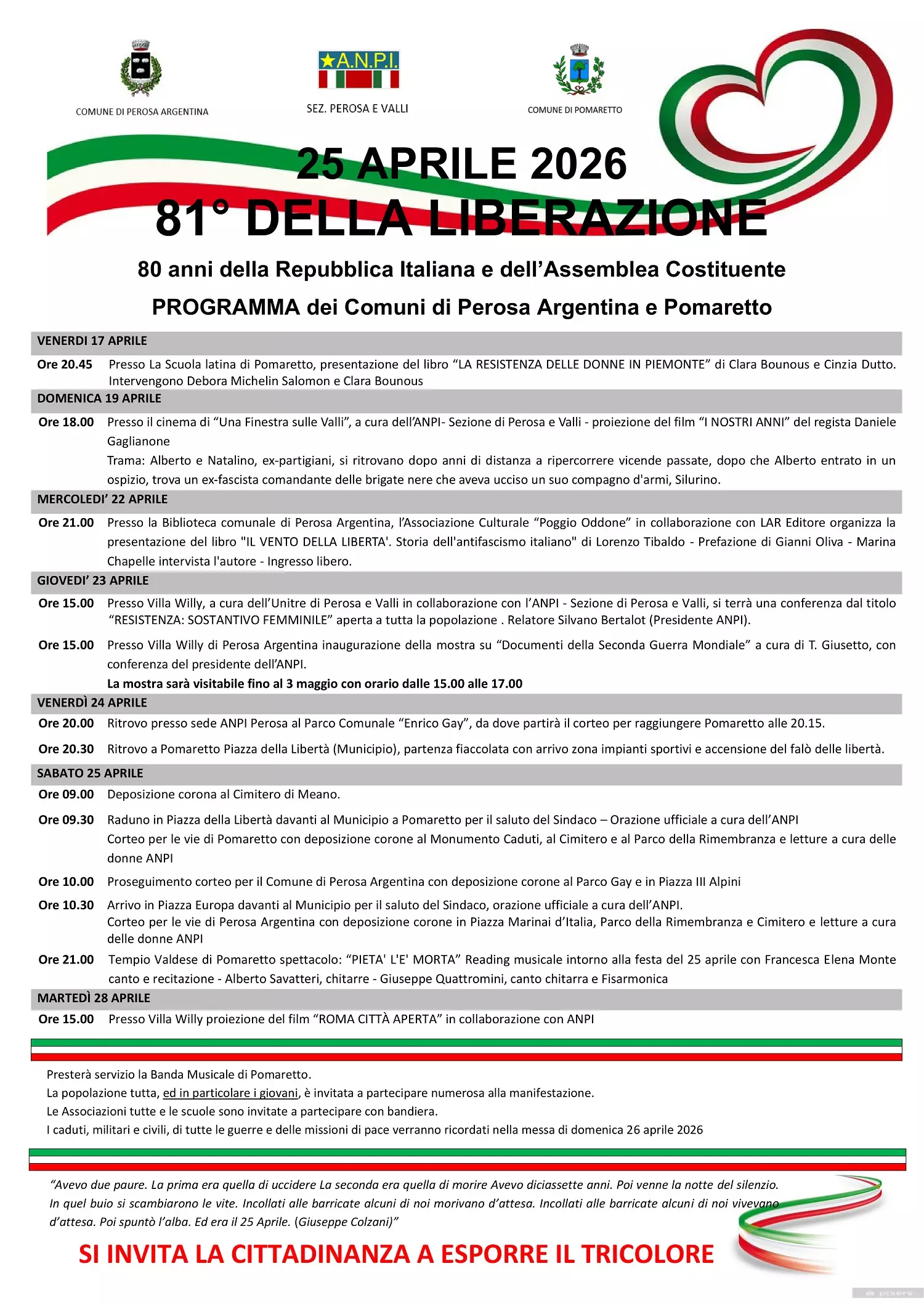 Il Comune di Pomaretto con il Comune di Perosa Argentina invita la cittadinanza a partecipare alle iniziative organizzate in occasione dell’81° anniversario della Liberazione.