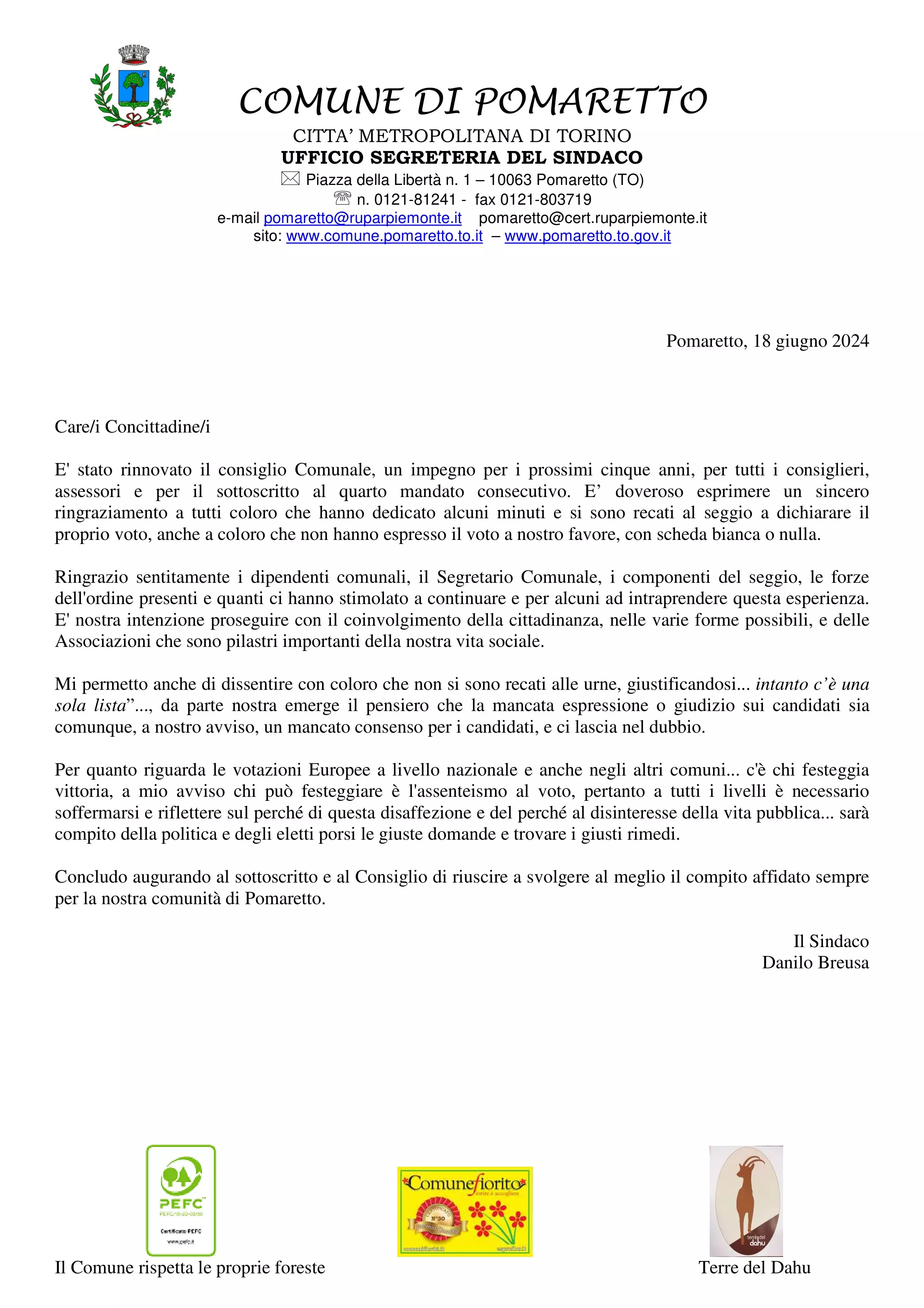 E' stato rinnovato il consiglio Comunale, un impegno per i prossimi cinque anni, per tutti i consiglieri, assessori e per il sottoscritto al quarto mandato consecutivo. E’ doveroso esprimere un sincero ringraziamento a tutti coloro che hanno dedicato alcuni minuti e si sono recati al seggio a dichiarare il proprio voto, anche a coloro che non hanno espresso il voto a nostro favore, con scheda bianca o nulla.