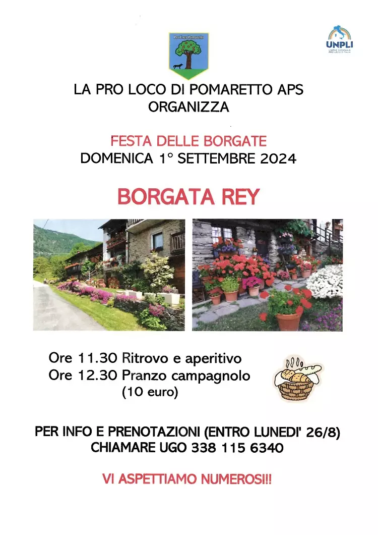 Descrizione La Pro Loco di Pomaretto organizza la festa della Borgata Rey domenica 1° settembre ore 11.30 ritrovo e aperitivoore 12.30 pranzo campagnolo (10 euro)per info e pronotazioni entro lunedì 26/08 chiamare Ugo 338 115 6340