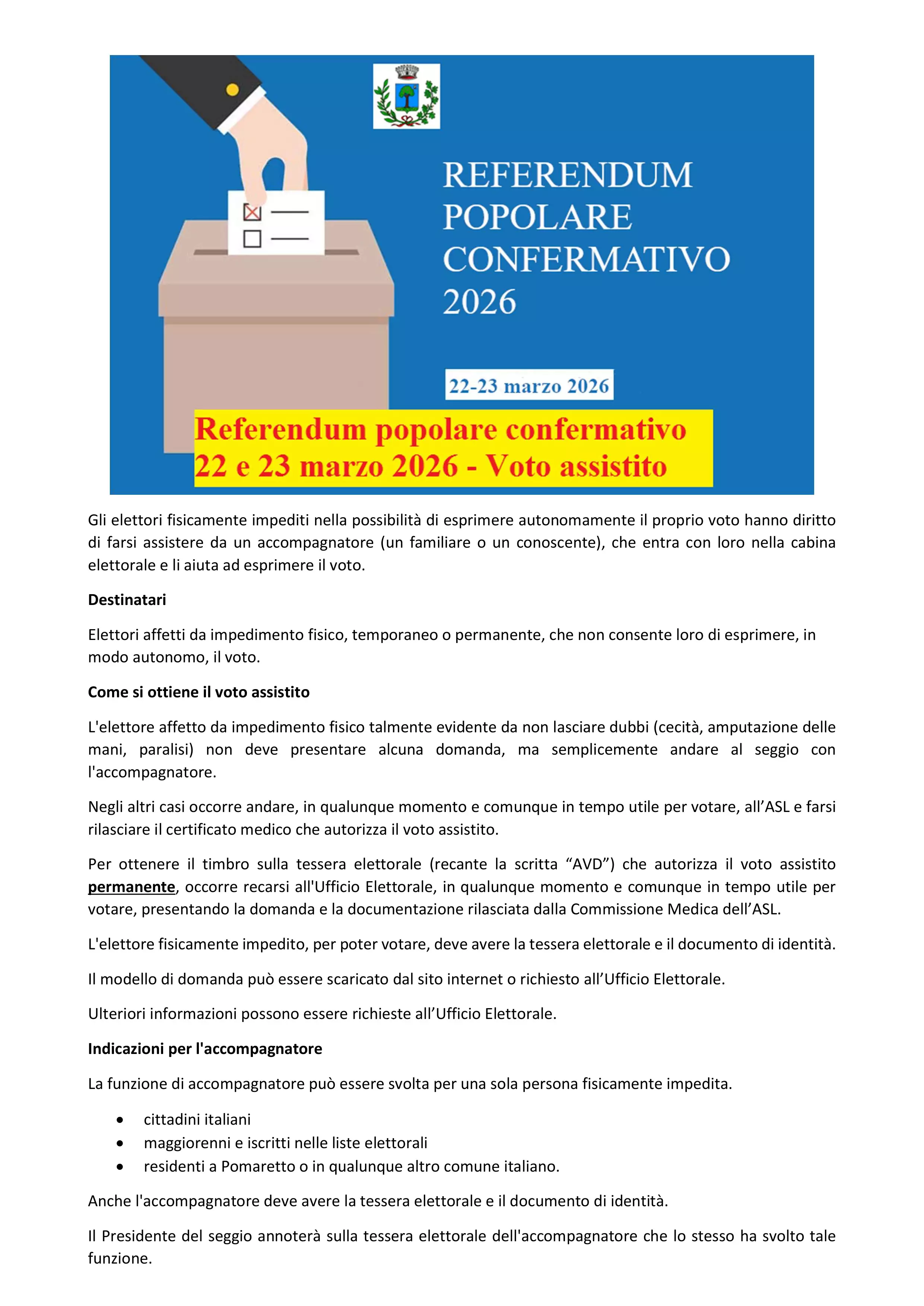 Gli elettori fisicamente impediti nella possibilità di esprimere autonomamente il proprio voto hanno diritto di farsi assistere da un accompagnatore (un familiare o un conoscente), che entra con loro nella cabina elettorale e li aiuta ad esprimere il voto.