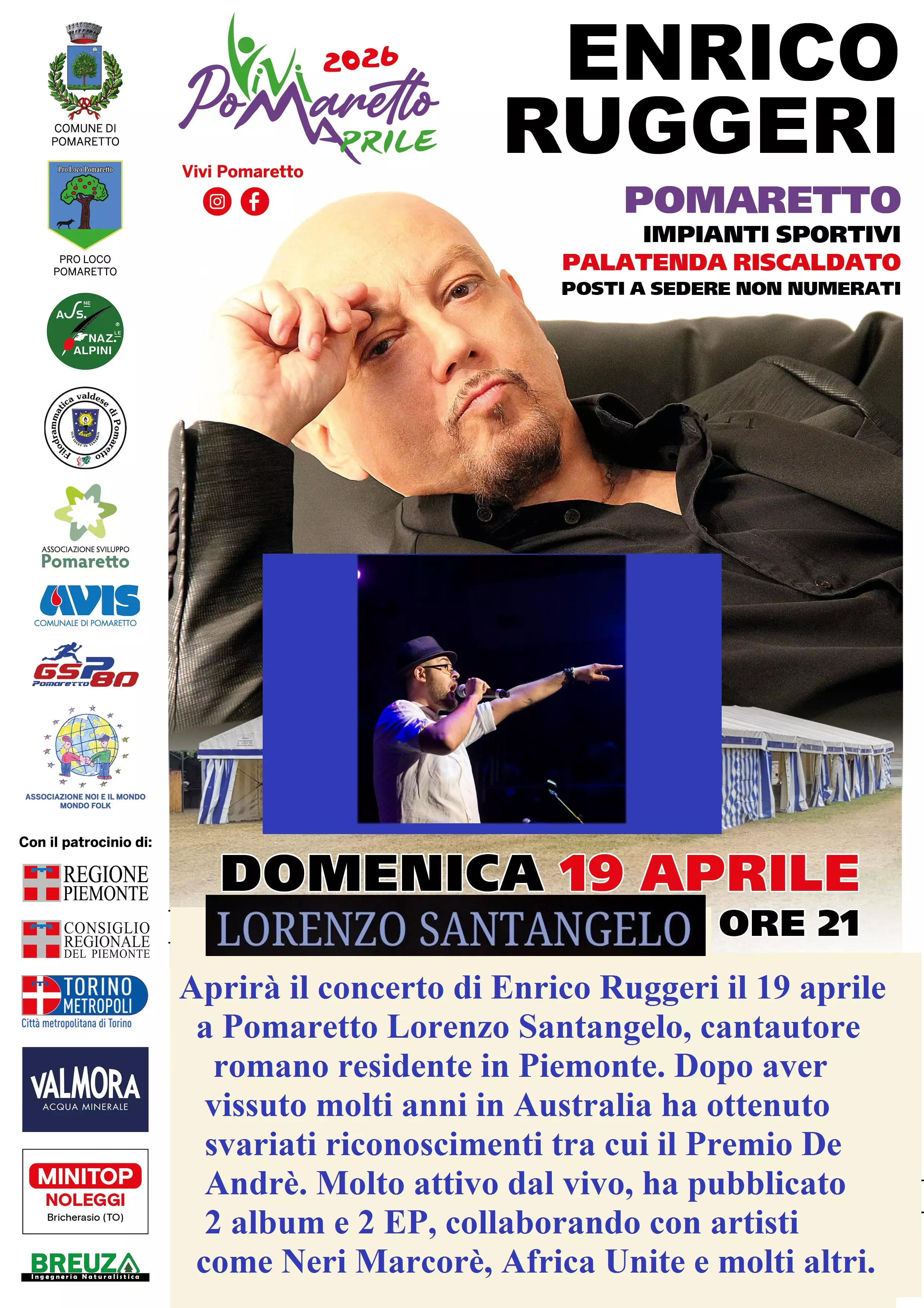 Aprirà il concerto di Enrico Ruggeri il 19 aprile a Pomaretto Lorenzo Santangelo, cantautore romano residente in Piemonte. Dopo aver vissuto molti anni in Australia ha ottenuto svariati riconoscimenti tra cui il Premio De Andrè. Molto attivo dal vivo, ha pubblicato 2 album e 2 EP, collaborando con artisti come Neri Marcorè, Africa Unite e molti altri.
