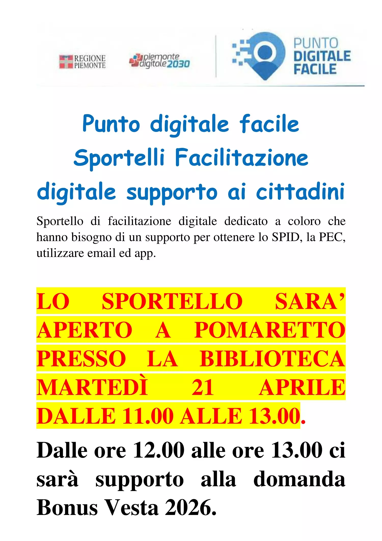 LO SPORTELLO SARA’ APERTO A POMARETTO PRESSO LA BIBLIOTECA MARTEDÌ 21 APRILE DALLE 11.00 ALLE 13.00.