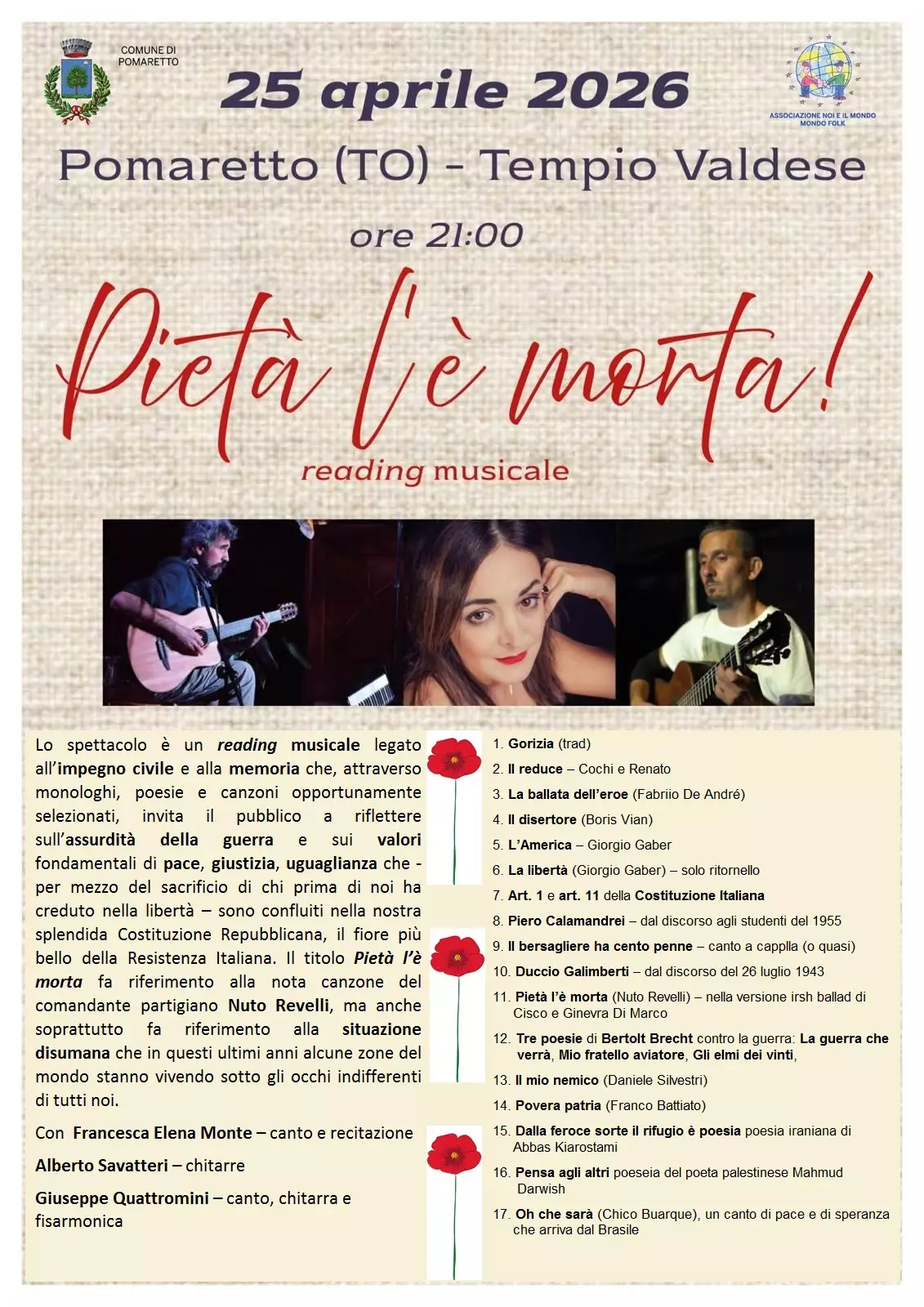 Ricordiamo che il 25 aprile presso il TEMPIO VALDESE di Pomaretto alle ore 21:00 ci sarà un reading musicale intorno alla festa del 25 aprile: Pietà l’è morta