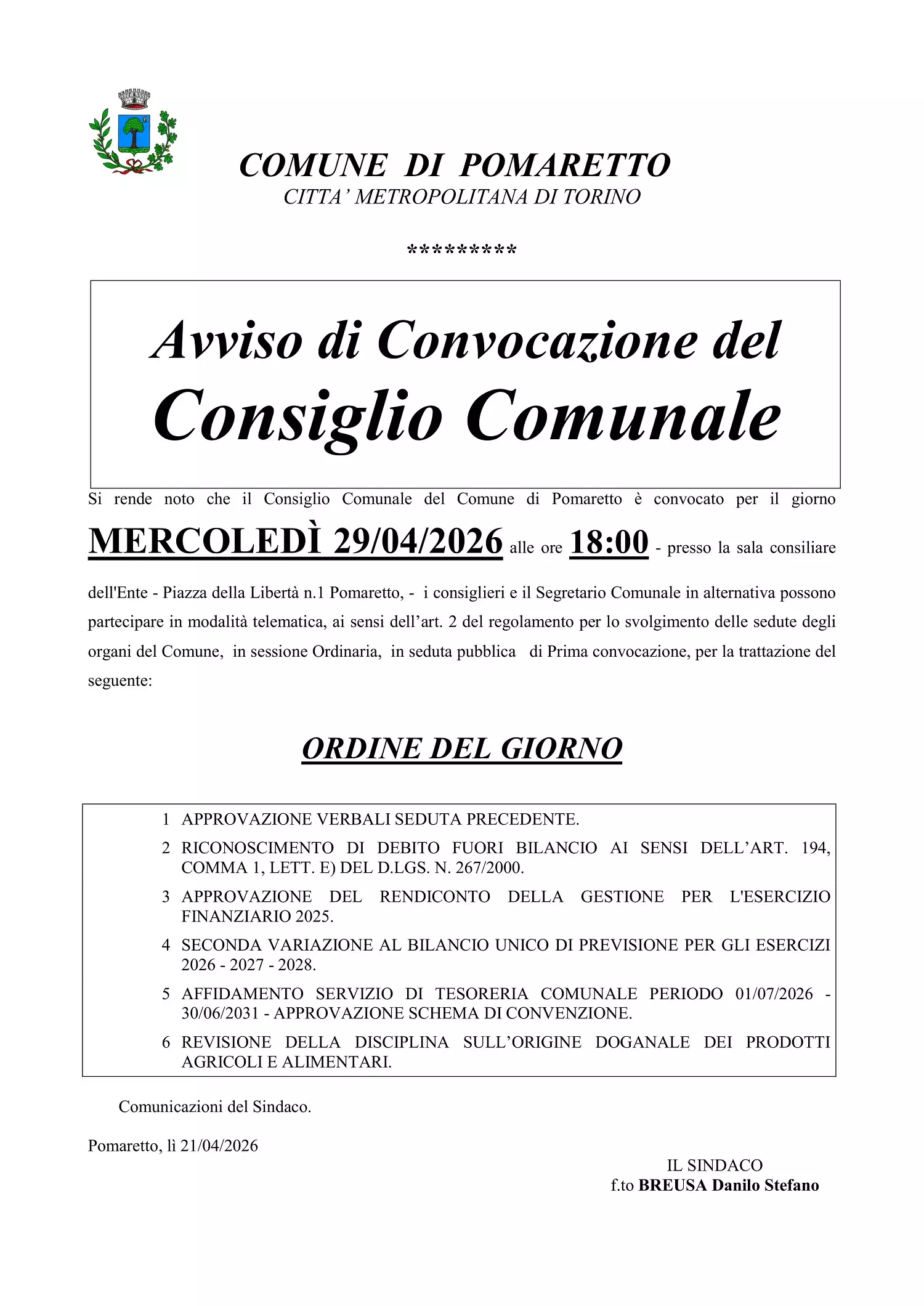 Si rende noto che il Consiglio Comunale del Comune di Pomaretto è convocato per il giorno MERCOLEDÌ 29/04/2026 alle ore 18:00