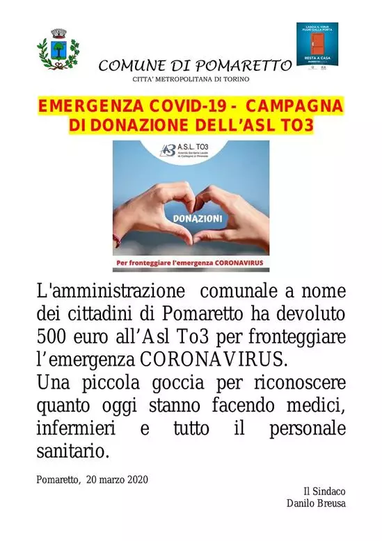 Descrizione L'amministrazione comunale a nome dei cittadini di Pomaretto ha devoluto 500 euro all’Asl To3 perfronteggiare l’emergenza CORONAVIRUS.Una piccola goccia per riconoscere quanto oggi stanno facendo medici, infermieri e tutto il personale sanitario.