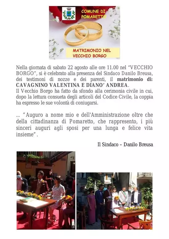 Descrizione Nella giornata di sabato 22 agosto alle ore 11.00 nel “VECCHIO BORGO”, si è celebrato alla presenza del Sindaco Danilo Breusa, dei testimoni di nozze e dei parenti, il matrimonio di:CAVAGNINO VALENTINA E DIANO’ ANDREA.