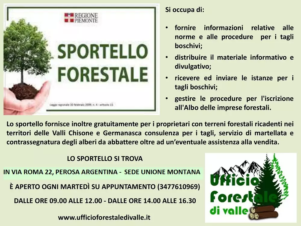 Lo sportello fornisce inoltre gratuitamente per i proprietari con terreni forestali ricadenti nei territori delle Valli Chisone e Germanasca consulenza per i tagli, servizio di martellata e contrassegnatura degli alberi da abbattere oltre ad un’eventuale assistenza alla vendita.