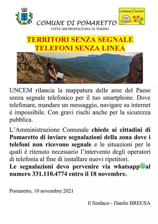 L’Amministrazione Comunale chiede ai cittadini di Pomaretto di inviare segnalazioni della zona dove i telefoni non ricevono segnale e le situazioni per le quali è ritenuto necessario l’intervento degli operatori di telefonia al fine di installare nuovi ripetitori.