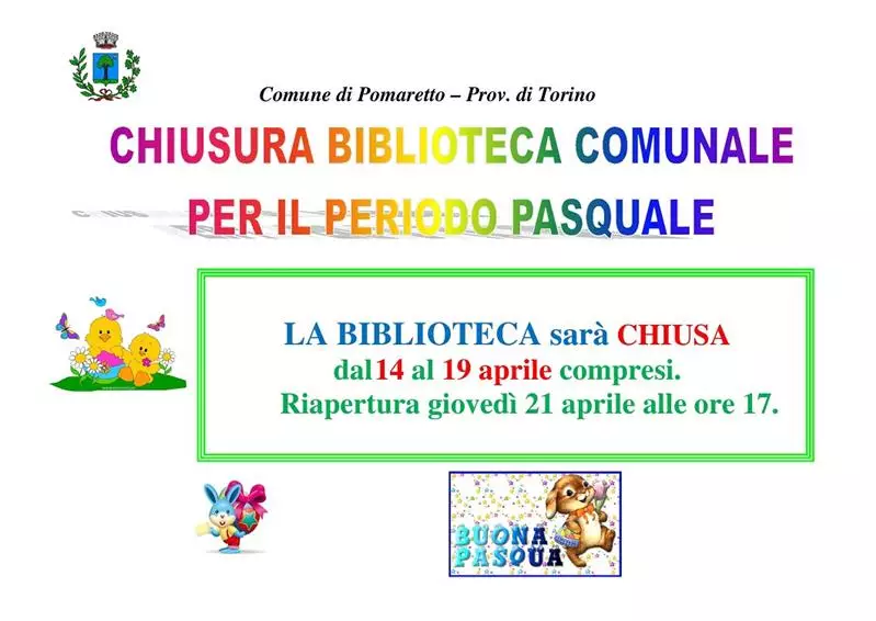 Descrizione LA BIBLIOTECA sarà CHIUSA dal 14 al 19 aprile compresi.Riapertura giovedì 21 aprile alle ore 17.