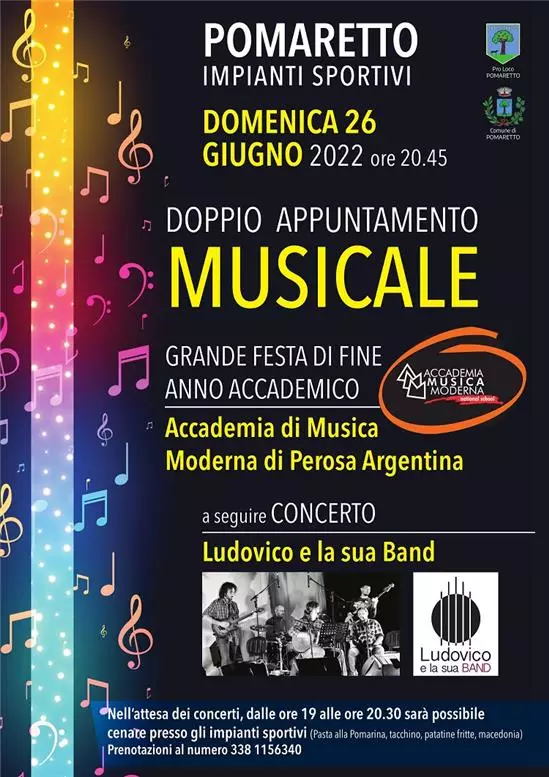Descrizione POMARETTO IMPIANTI SPORTIVI DOMENICA 26 GIUGNO 2022 ore 20.45GRANDE FESTA DI FINE ANNO ACCADEMICO Accademia di Musica Moderna di Perosa Argentinaa seguire CONCERTO Ludovico e la sua Band