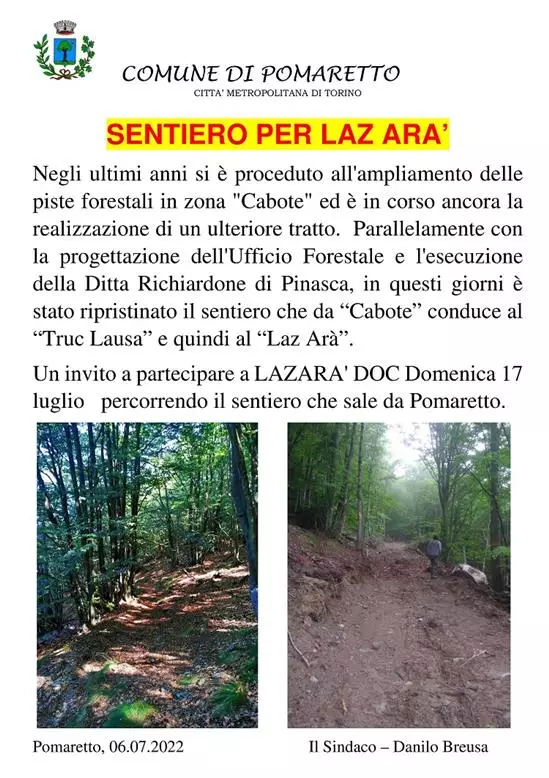 Un invito a partecipare a LAZARA' DOC Domenica 17 luglio percorrendo il sentiero che sale da Pomaretto.