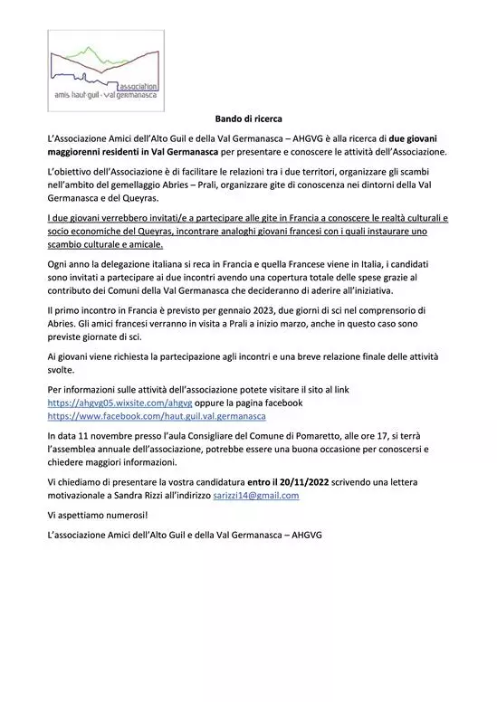 L'obbiettivo è quello di trovare due giovani maggiorenni per presentare e conoscere le attività dell'Associazione, relativa ad organizzare scambi e incontri nell'ambito del gemellaggio Abries - Prali, gite nei dintorni della Val Germanasca e del Queyras.