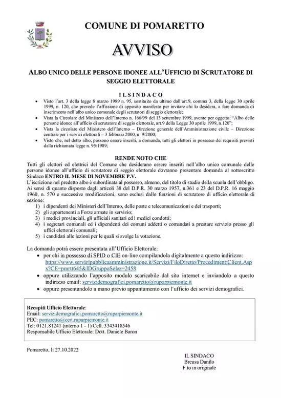 Tutti gli elettori ed elettrici del Comune che desiderano essere inseriti nell’albo unico comunale delle persone idonee all’ufficio di scrutatore di seggio elettorale dovranno presentare domanda al sottoscritto Sindaco ENTRO IL MESE DI NOVEMBRE P.V.