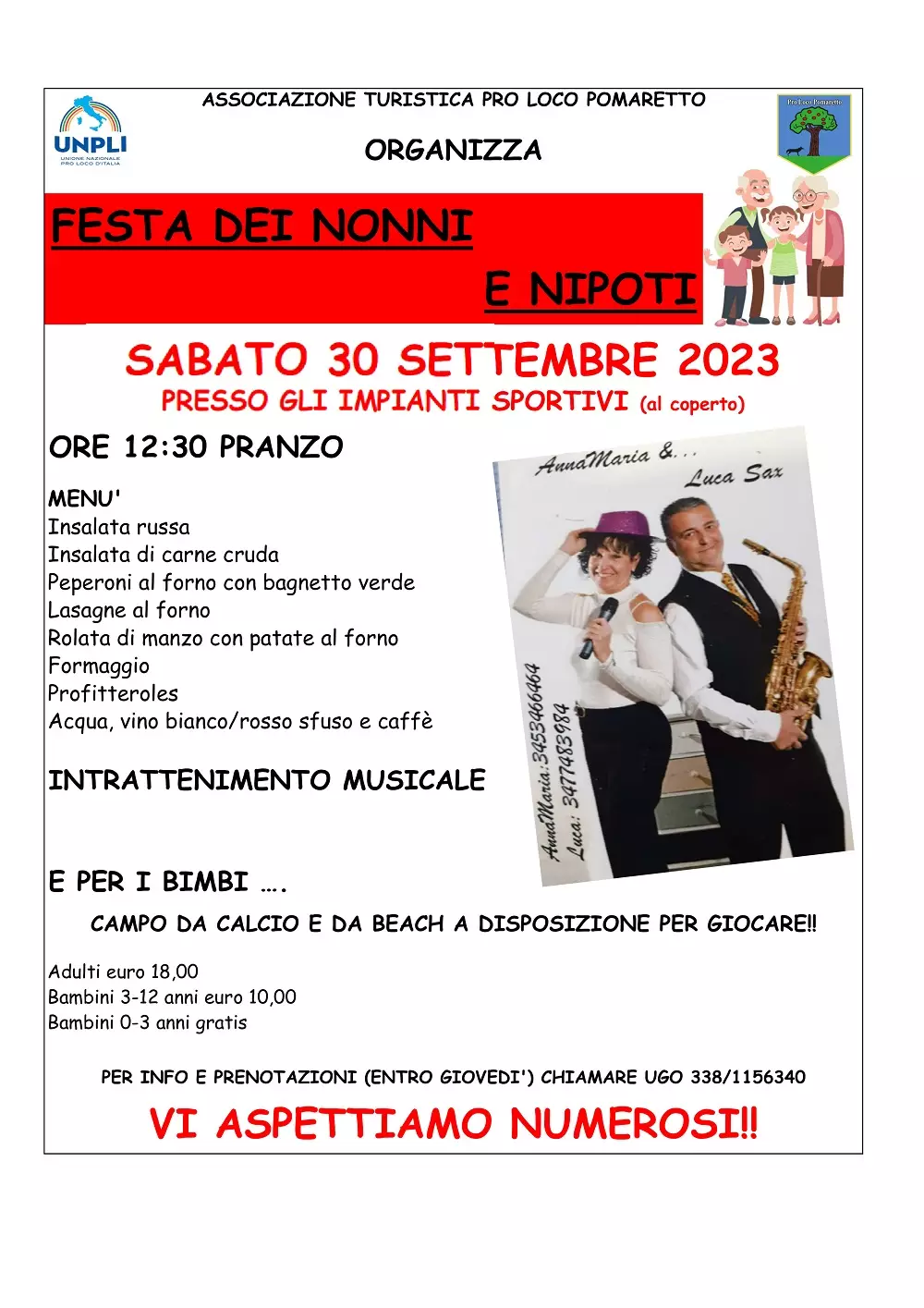 PER INFO E PRENOTAZIONI (ENTRO GIOVEDI') CHIAMARE UGO 338/1156340