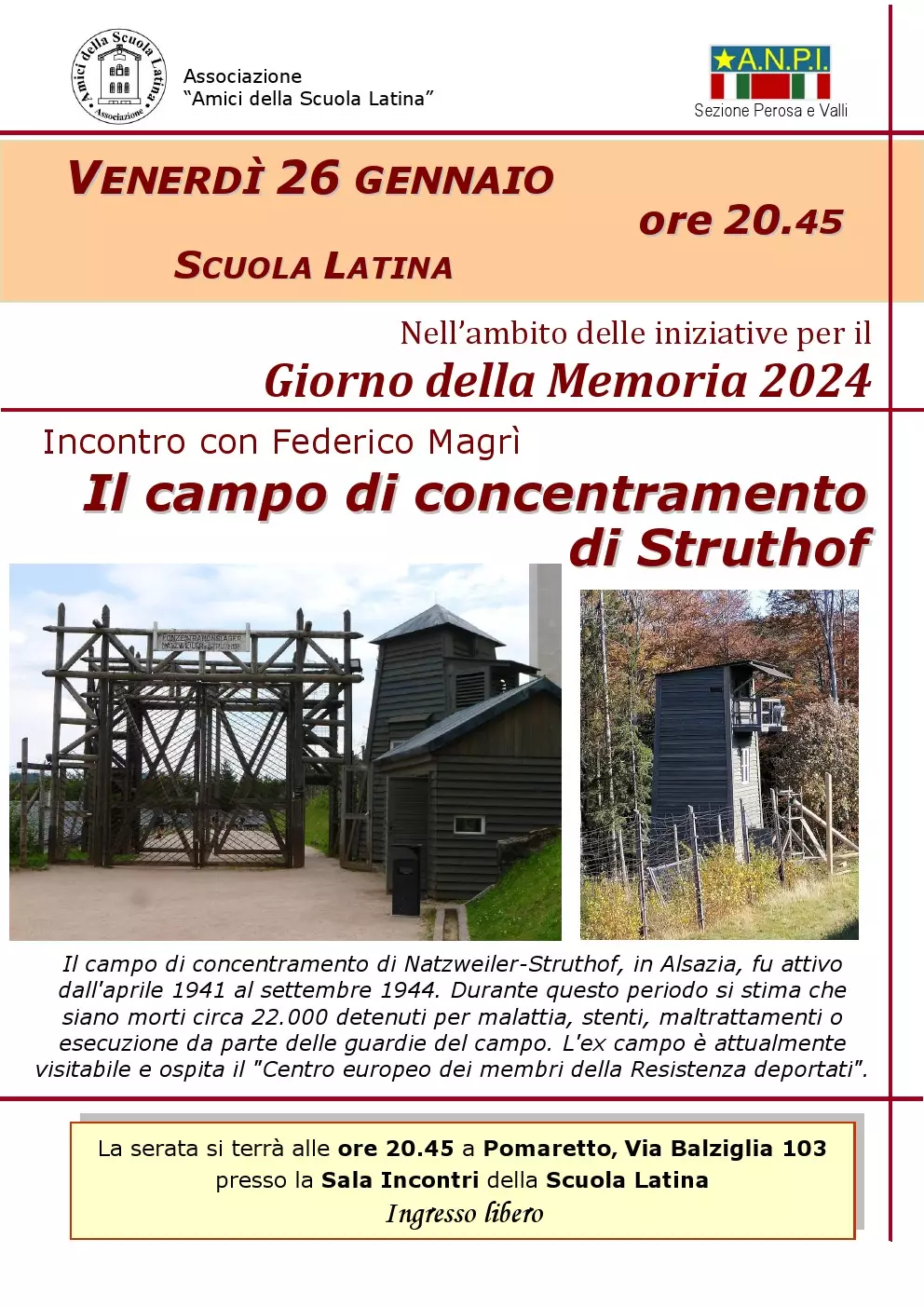 Venerdì 26 gennaio, alle ore 20.45, alla Scuola Latina di Pomaretto, è in programma un incontro con Federico Magrì avente per tema: Il campo di concentramento di Struthof, in Alsazia.